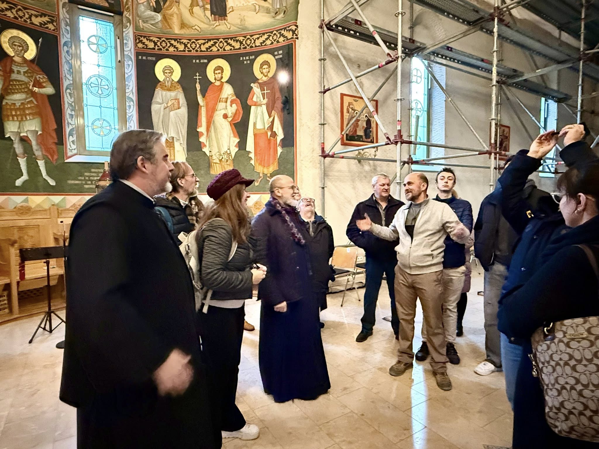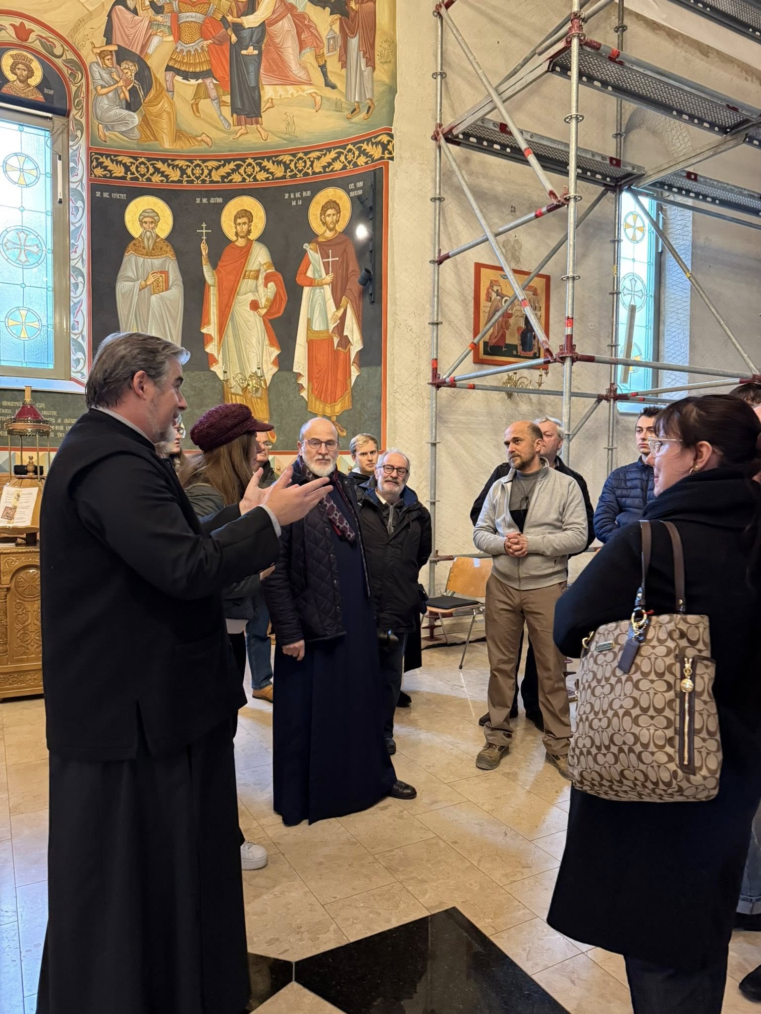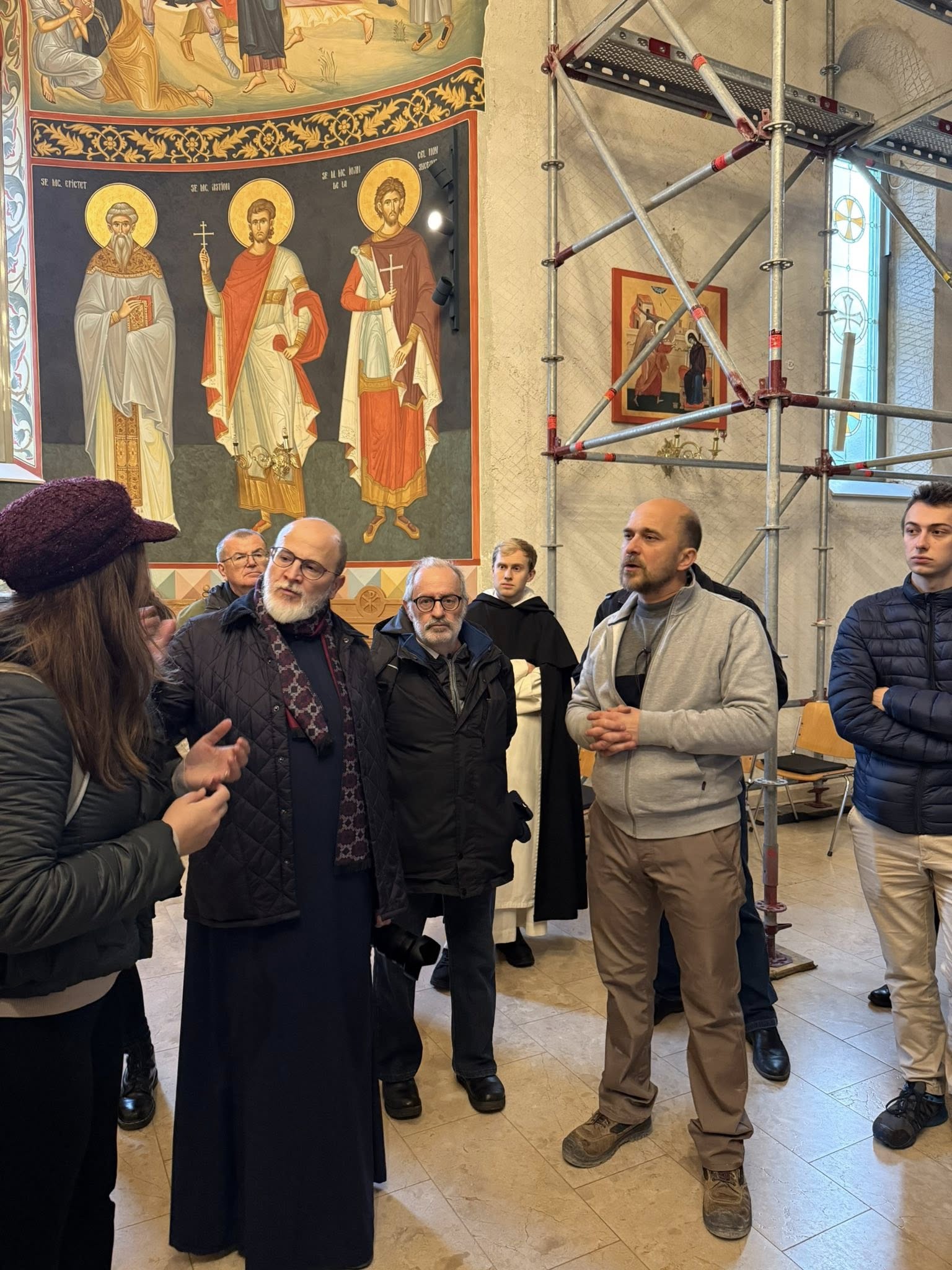 În continuarea vizitei, grupul a intrat în dialog cu prof. Alexandru Nicolau, pictorul bisericii, care le-a prezentat semnificația iconografiei ortodoxe și importanța picturii în frescă. Acesta a explicat modul în care arta sacră transmite credința și teologia Bisericii, vorbind despre simbolismul culorilor, structura compozițiilor și tehnica specifică frescei, un proces ce îmbină rigoarea artistică și trăirea spirituală.