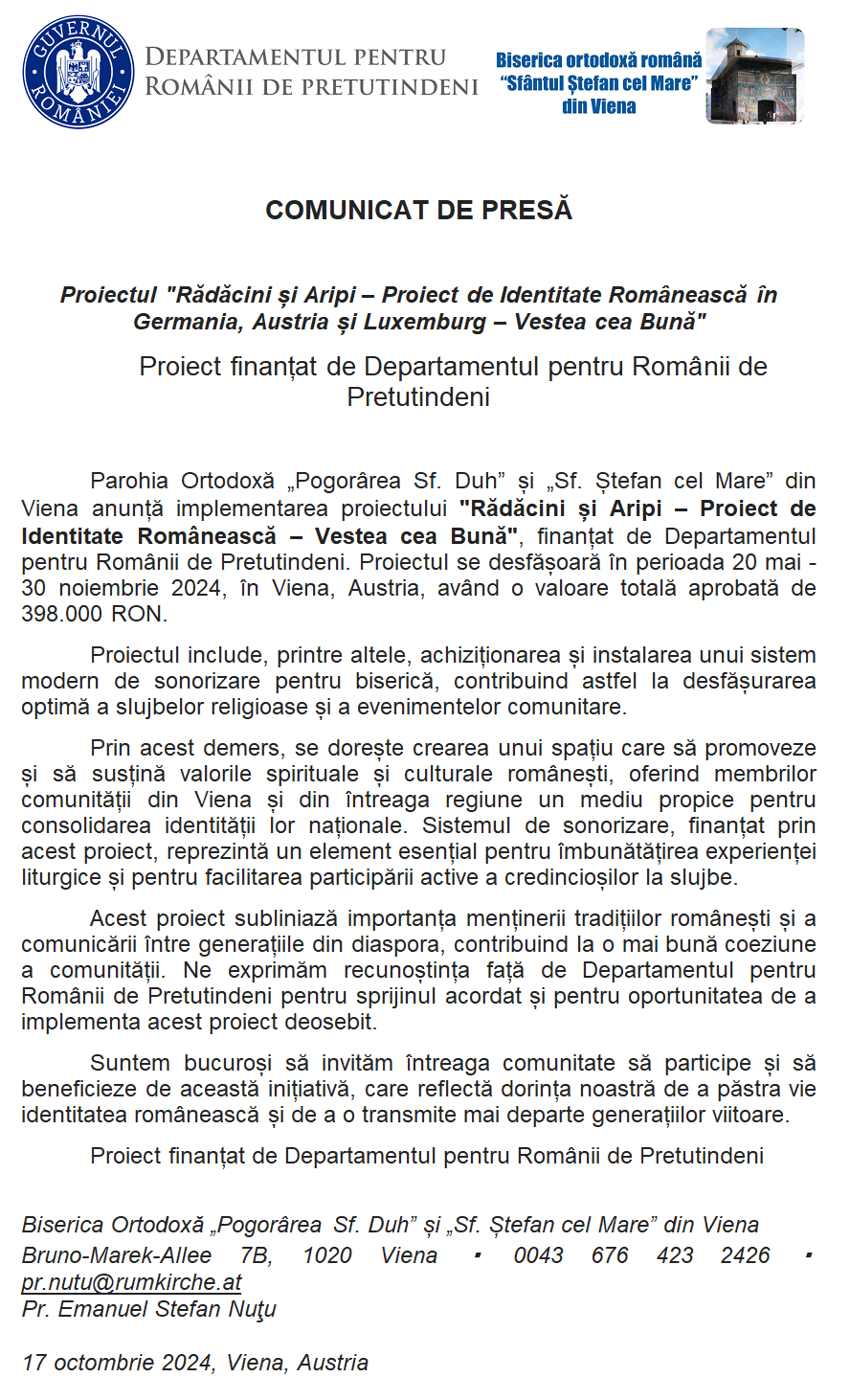 Parohia Ortodoxă „Pogorârea Sf. Duh” și „Sf. Ștefan cel Mare” din Viena anunță implementarea proiectului „Rădăcini și Aripi – Proiect de Identitate Românească – Vestea cea Bună”, finanțat de Departamentul pentru Românii de Pretutindeni. Proiectul se desfășoară în perioada 20 mai – 30 noiembrie 2024, în Viena, Austria, având o valoare totală aprobată de 398.000 RON.