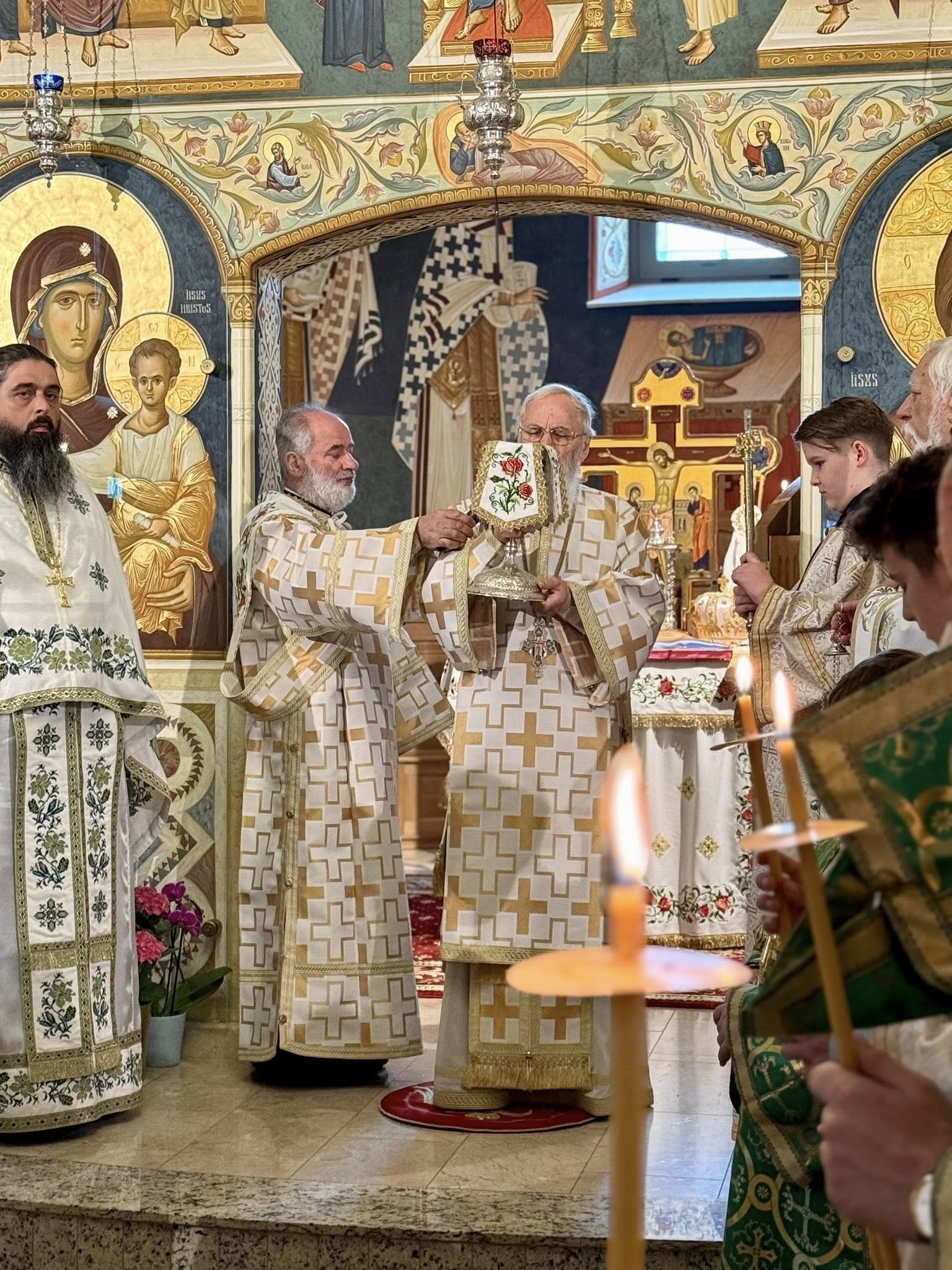 Cea mai așteptată zi pentru slujitori și credincioși deopotrivă a fost ziua hramului, sărbătoarea Pogorârii Sfântului Duh. Așadar, astăzi, a fost săvârșită Sfânta Liturghie de IPS Părinte Mitropolit Serafim, înconjurat de preoți și diaconi, urmată de Vecernia plecării genunchilor și de binecuvântarea ramurilor de tei înflorit. Credincioșii, veniți în număr mare, mulți îmbrăcați în veșminte populare, au luat parte cu bucurie și evlavie la rugăciunile comune, mulți împărtășindu-se. Răspunsurile au fost date de corul bisericii, dirijat de dna profesoară Ecaterina Coresi.