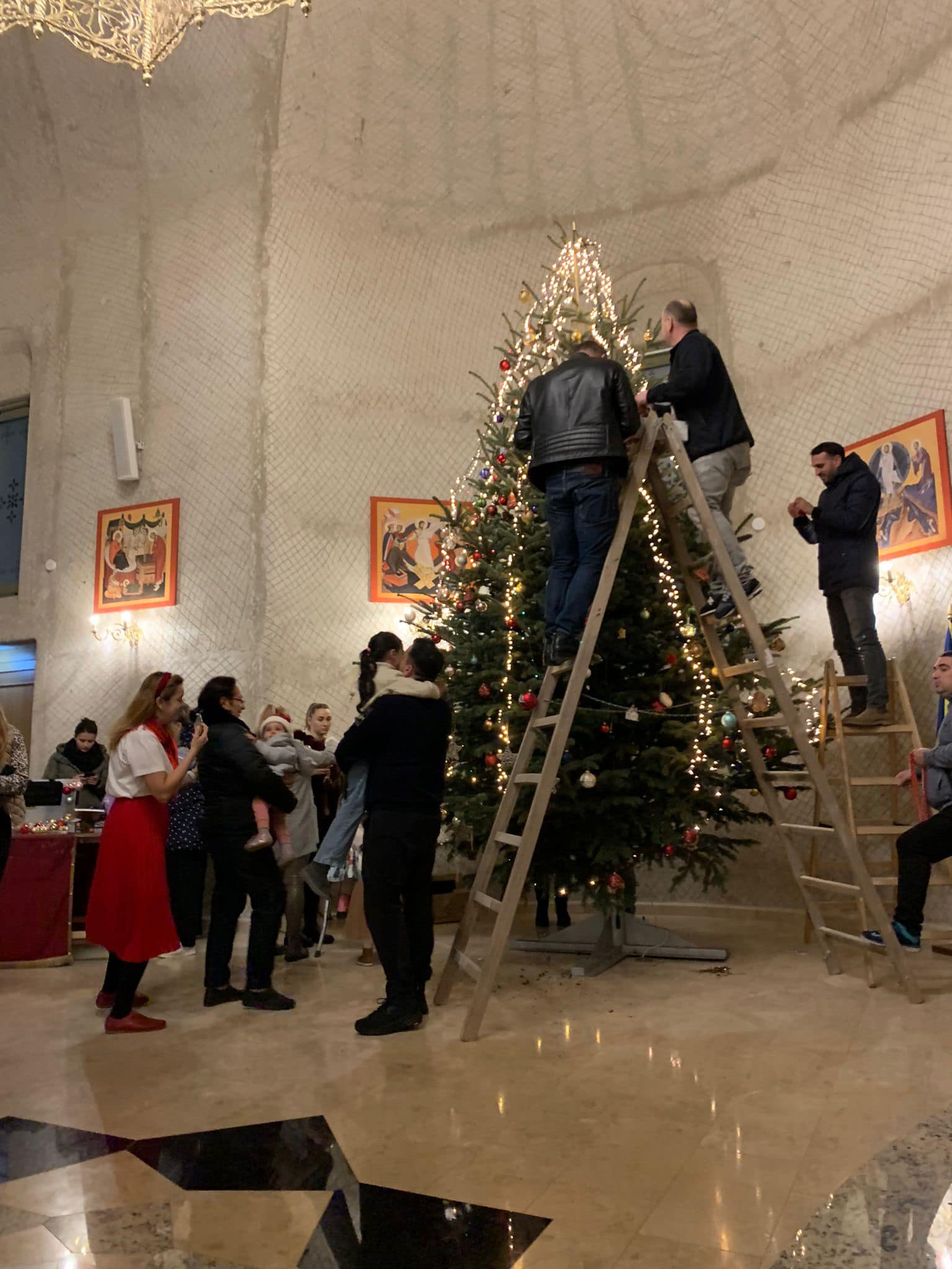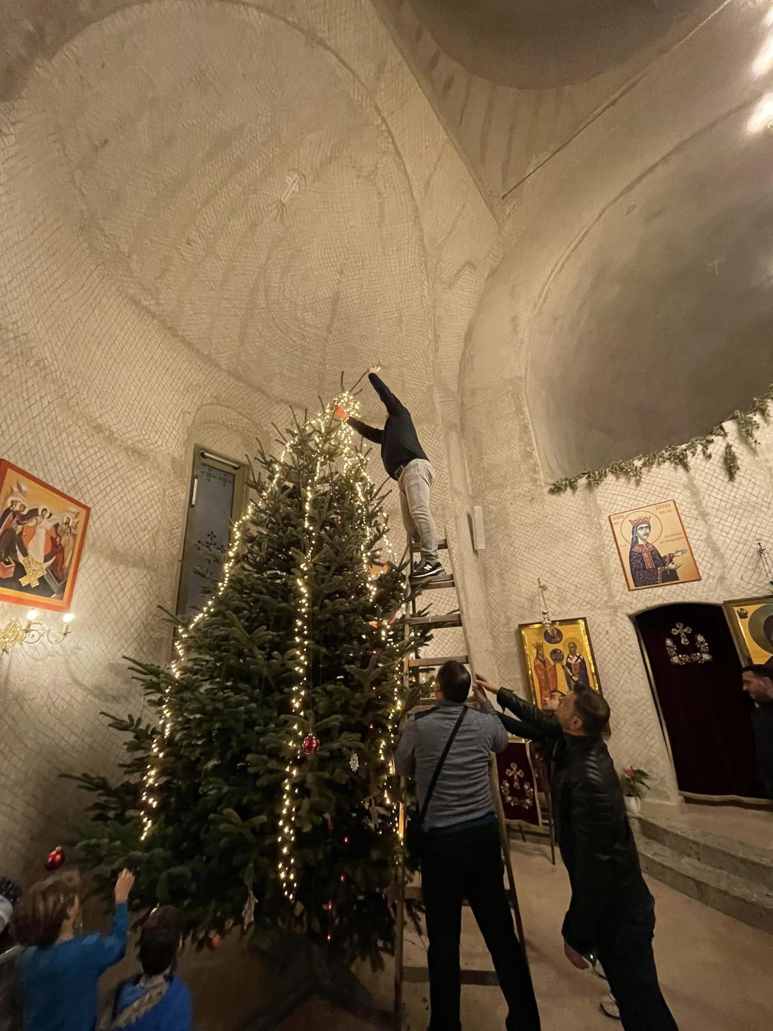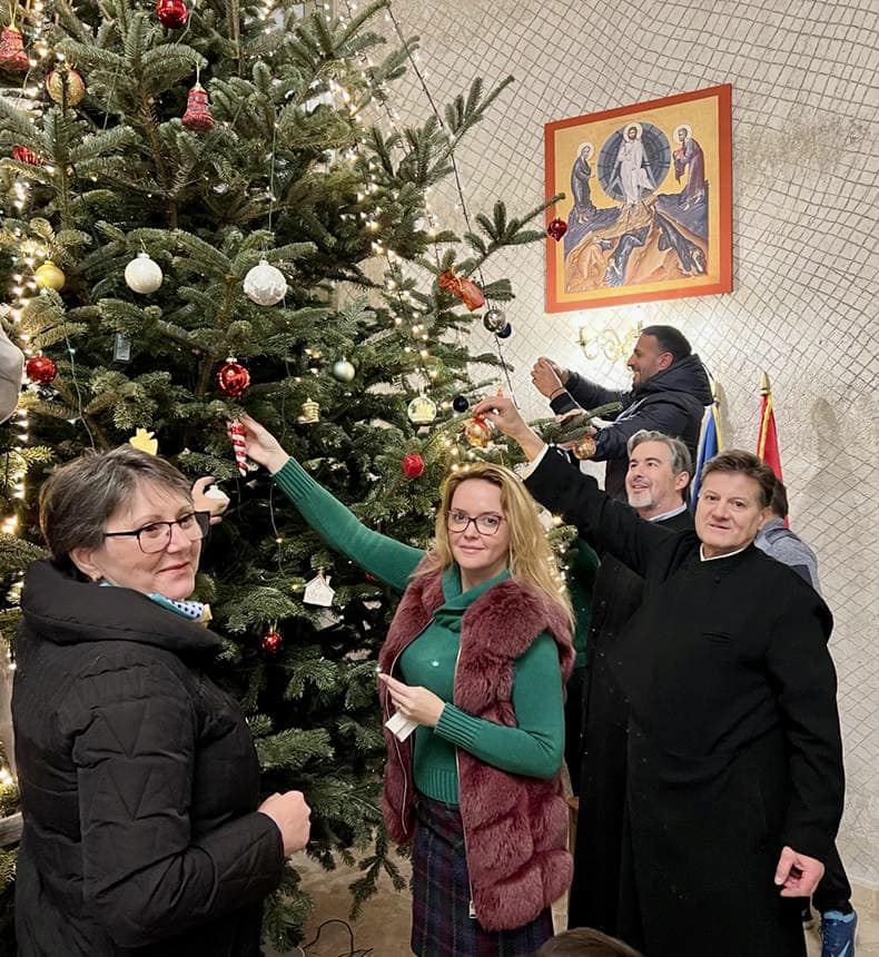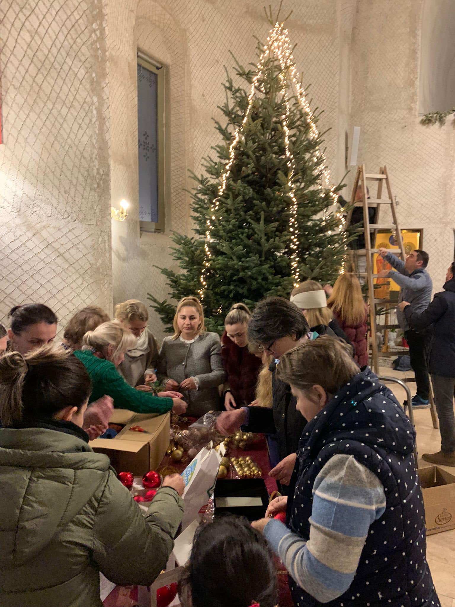 Cu mic, cu mare, în cântarea de colinde a Coralei bisericii, ne-am întins mâinile pentru a împodobi cât mai frumos cu globuri și decorațiuni bradul minunat primit în dar de la o familie din Comunitate.