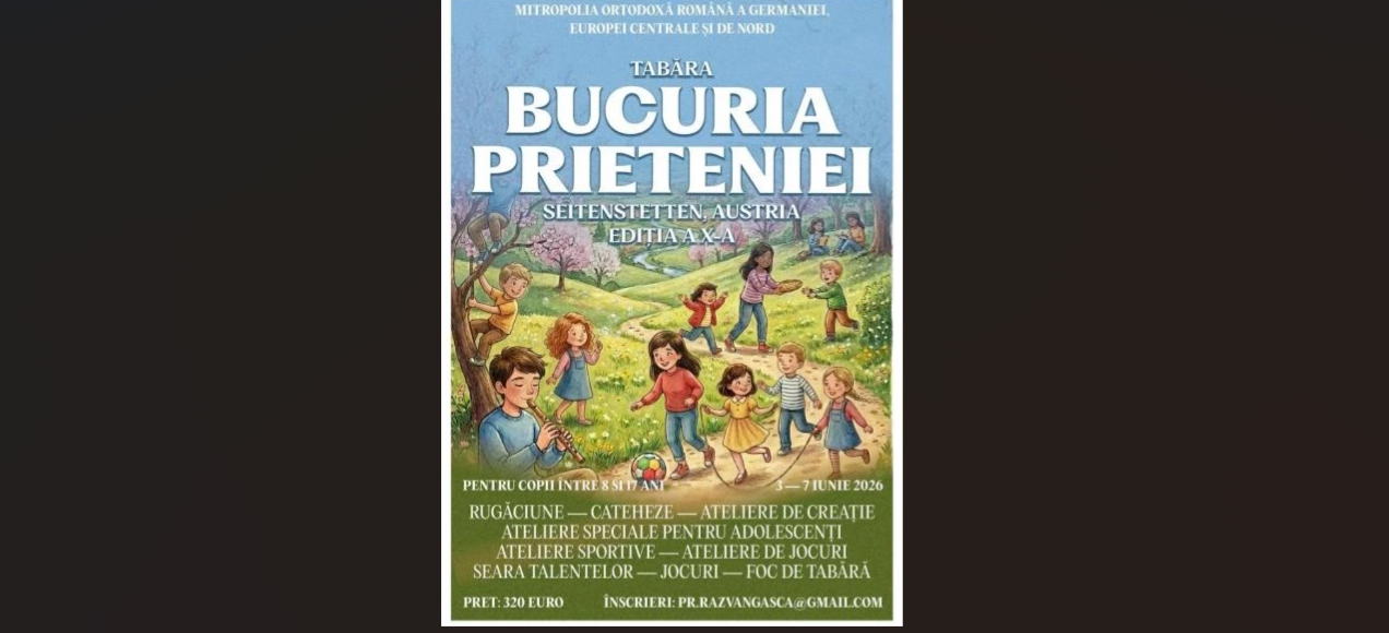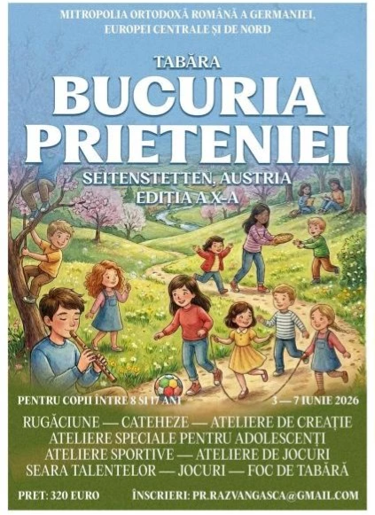După experiența de neuitat a edițiilor trecute, Mitropolia Germaniei, Europei Centrale și de Nord are bucuria de a anunța pregătirile pentru cea de-a X-a ediție (3-7 iunie) a taberei „Bucuria Prieteniei”. Ajuns la un prag aniversar (sub semnul cunoașterii propriei identități și a comuniunii), acest proiect continuă să fie un punct de reper pentru copiii și adolescenții din Arhiepiscopia noastră, oferindu-le cadrul ideal pentru a lega prietenii durabile și pentru a-și descoperi identitatea creștină într-un mod interactiv.