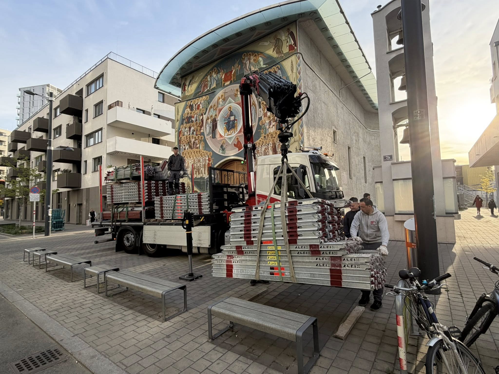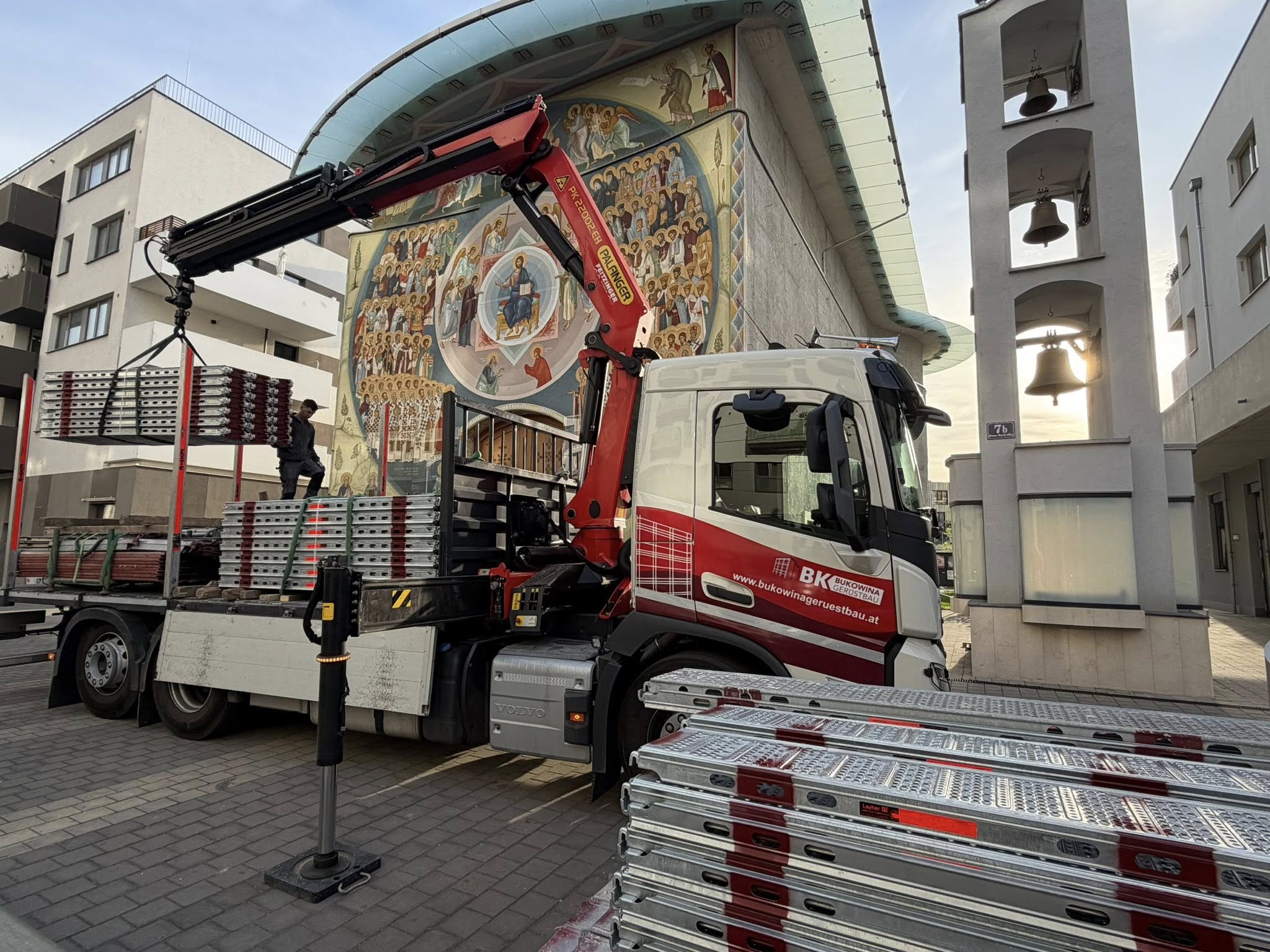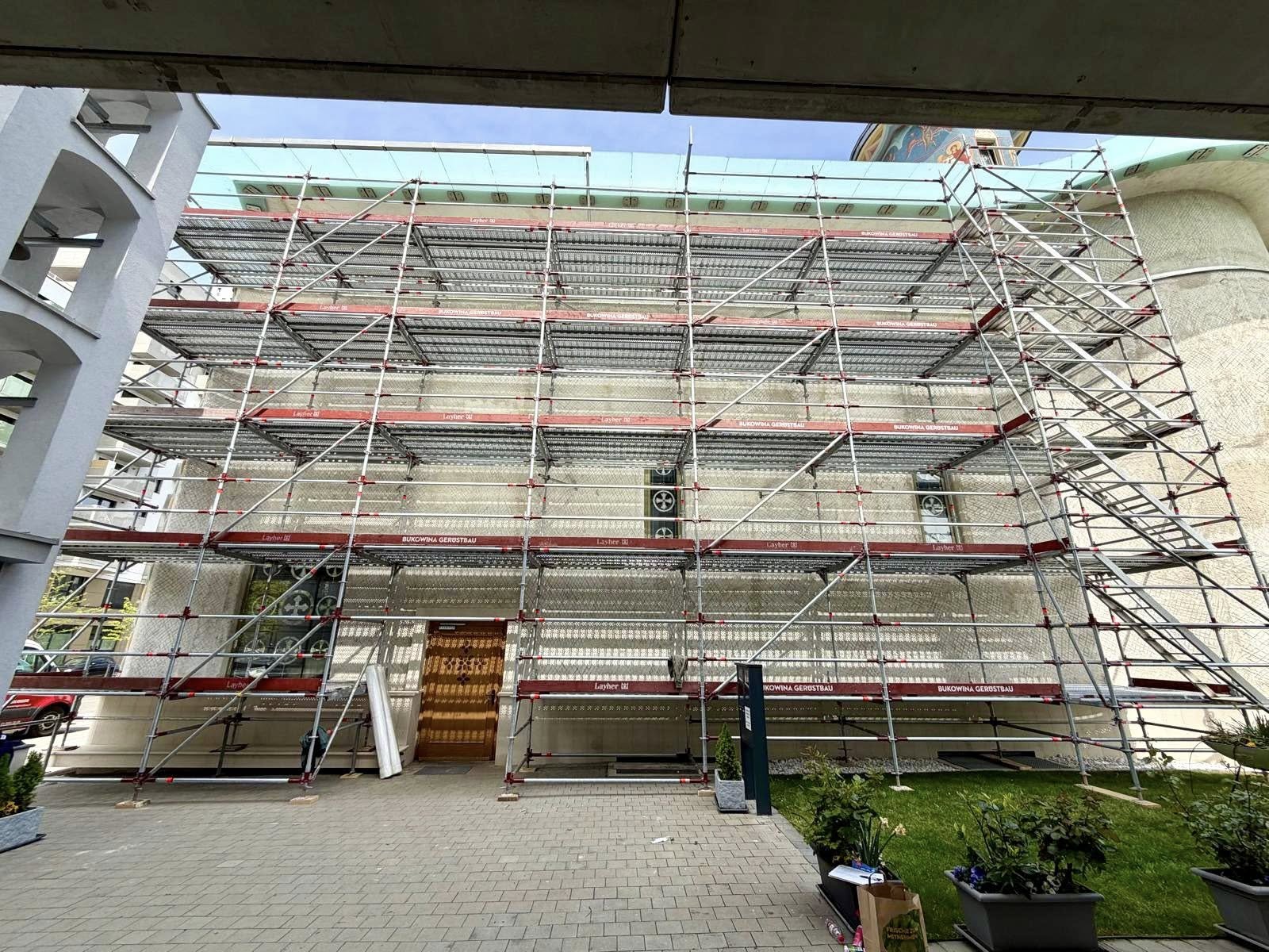 Astăzi a fost montată schela de către firma Bukowina Gerüstbau. Mulțumim domnului director Vasile Schiriac și întregii echipe, care de fiecare dată când este nevoie sprijină cu mult profesionalism montarea și reglarea schelei.